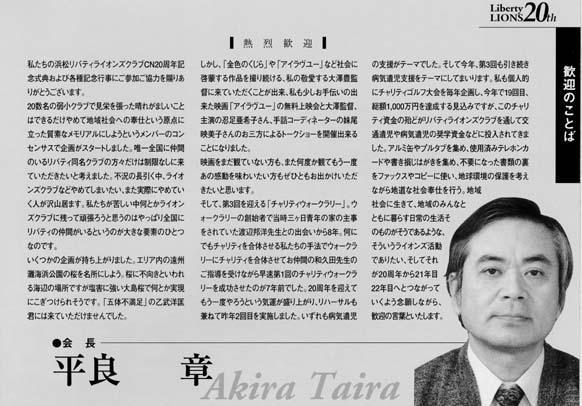 私たちの浜松リバティライオンズクラブCN20周年記念式典および各種記念行事にご参加ご協力を賜りありがとうございます。20数名の弱小クラブで見栄を張った晴れがましいことはできるだけやめて地域社会への奉仕という原点に立った質素なメモリアルにしようというメンバーのコンセンサスで企画がスタートしました。ただ唯一全国に仲間のいるリバティ同盟クラブの方々だけは制限なしに来ていただきたいと考えました。この不況の長引く中、ライオンズクラブなど止めてしまいたい、また実際にやめていく人が沢山います。私たちが苦しい中何とかライオンズクラブに残って頑張ろうと思うのはやっぱり全国にリバティの仲間がいるというのが大きな要素の一つなのです。